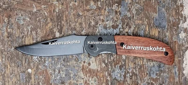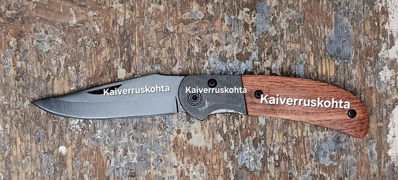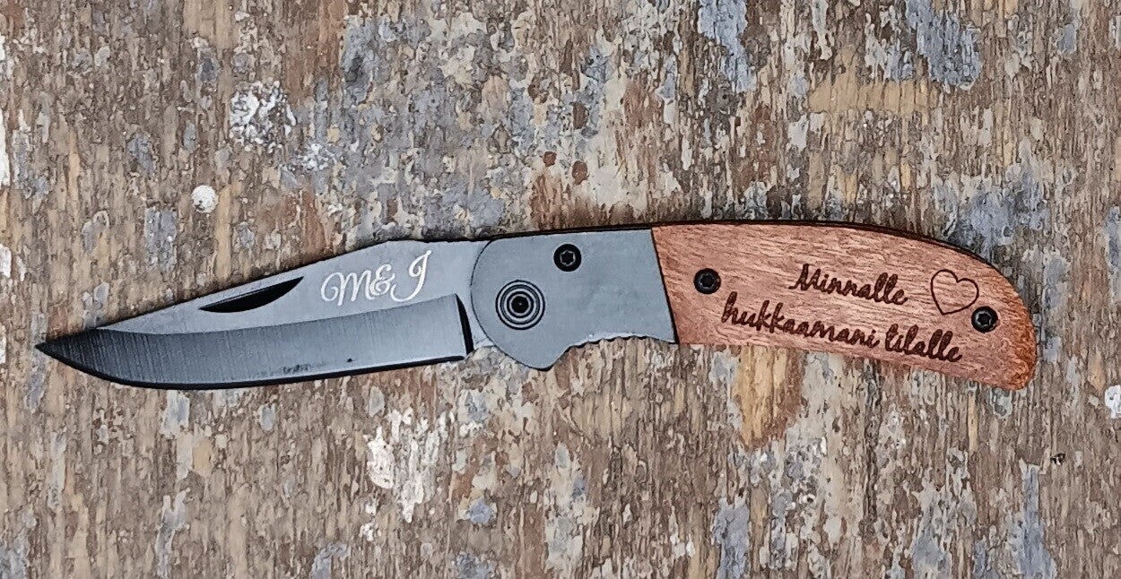 Tähän veitseen voit kaiverruttaa tekstiä, tai kuvan omalla aineistollasi. Kuva vain yksinkertainen logo tyylinen.