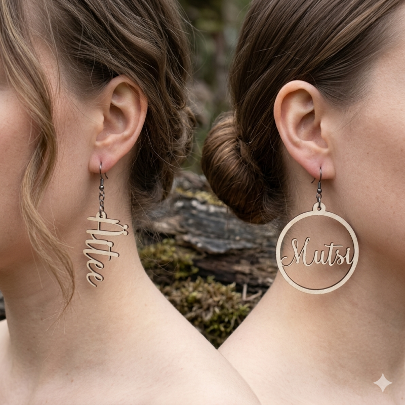 Puukorvis omalla logolla, aiheella, tekstillä jne. Myös tekstin kaiverrus mahdollista mikäli pelkkä leikkaus ei riitä. Mallikuvat leikatuista korviksista.